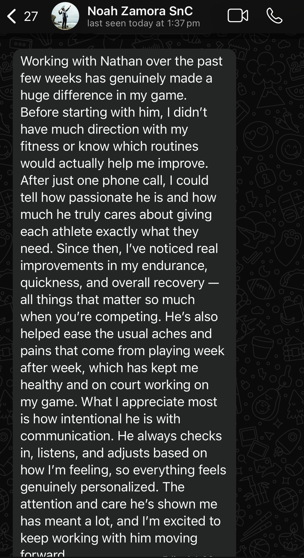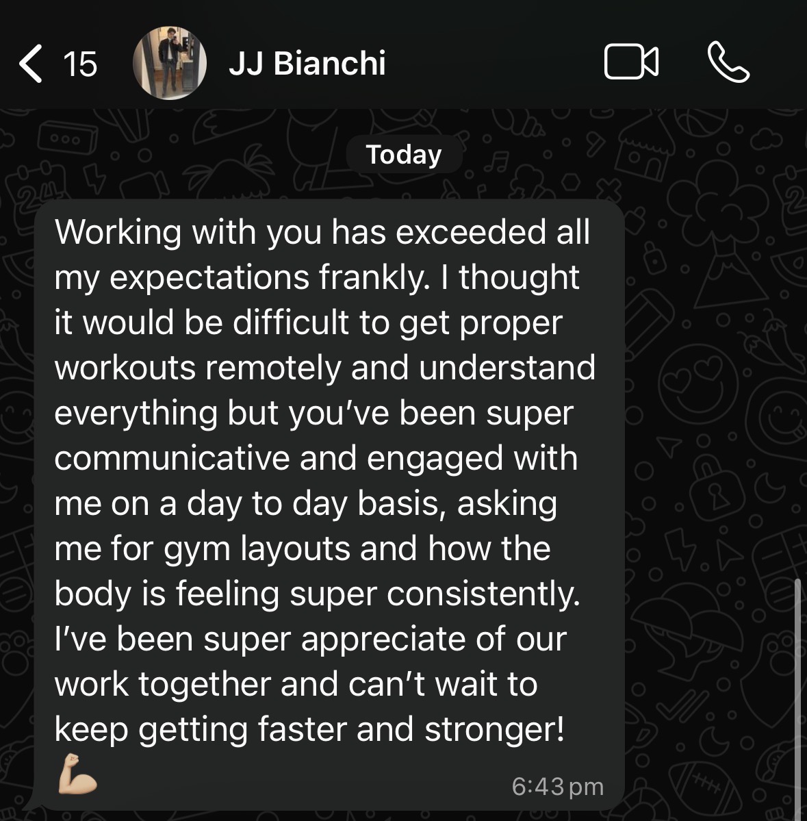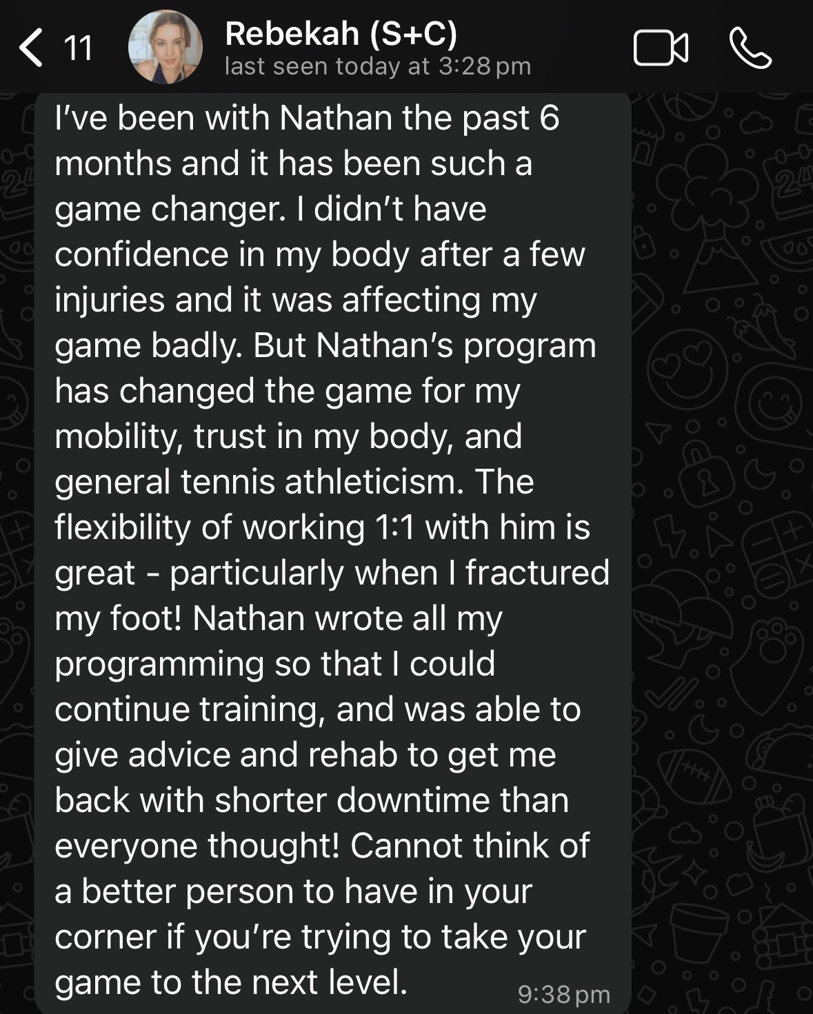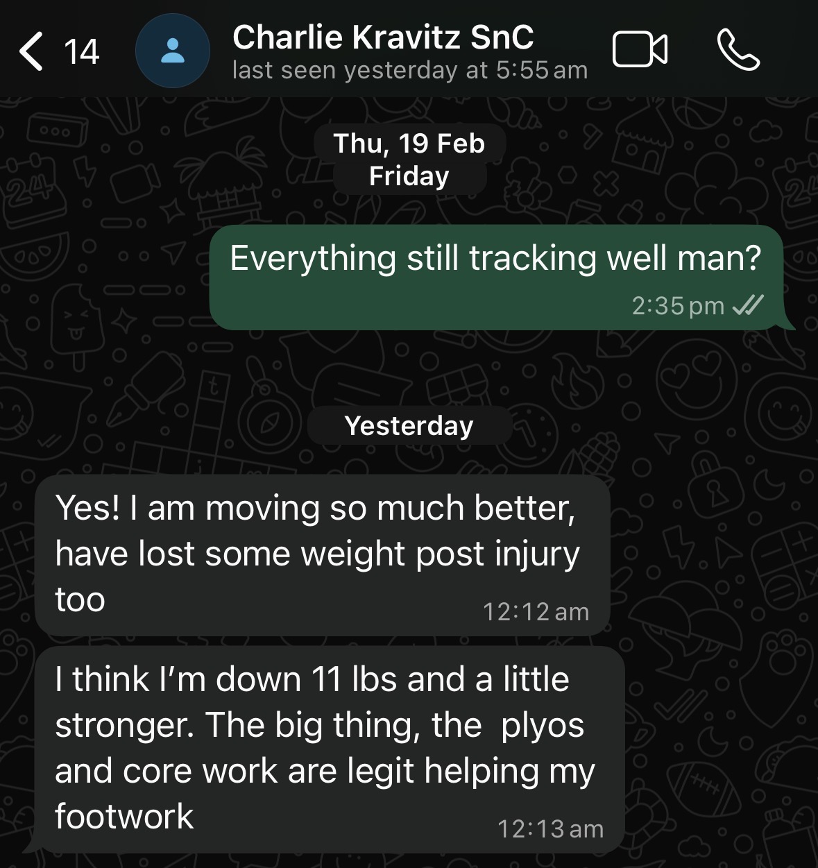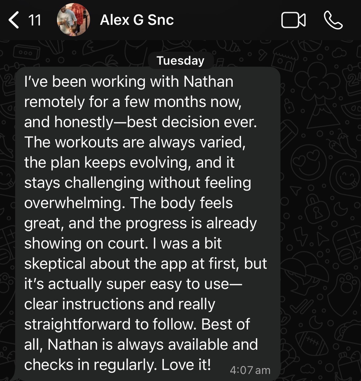 The vast majority of the players I am currently working with have done remote S+C with other trainers before as well. I look to build good connections with my clients, and maintain a very high level of communication to ensure that you get the most out of the programming. I pride myself on good communication. Read through my testimonials and you will see that my communication is a stand out feature.