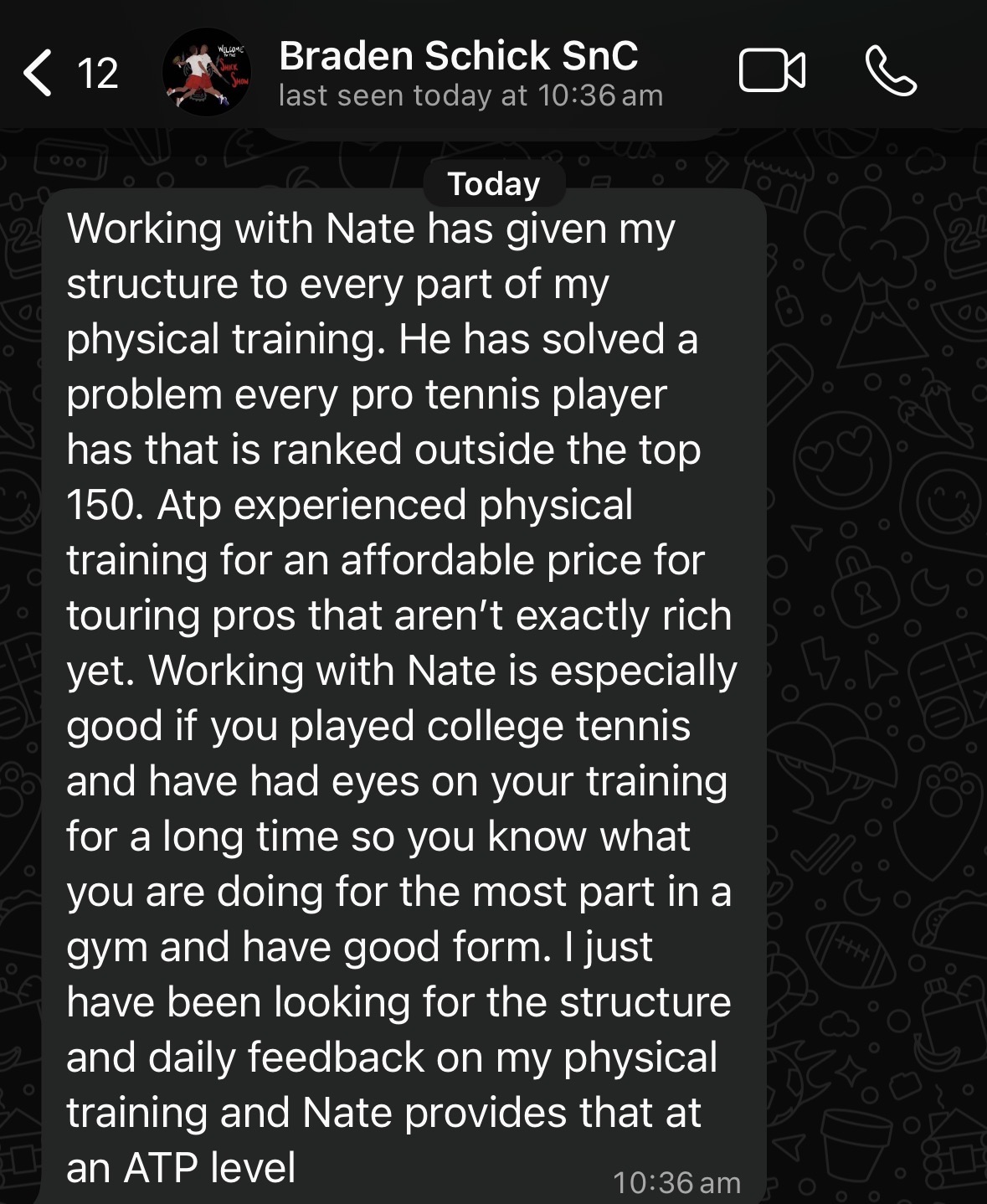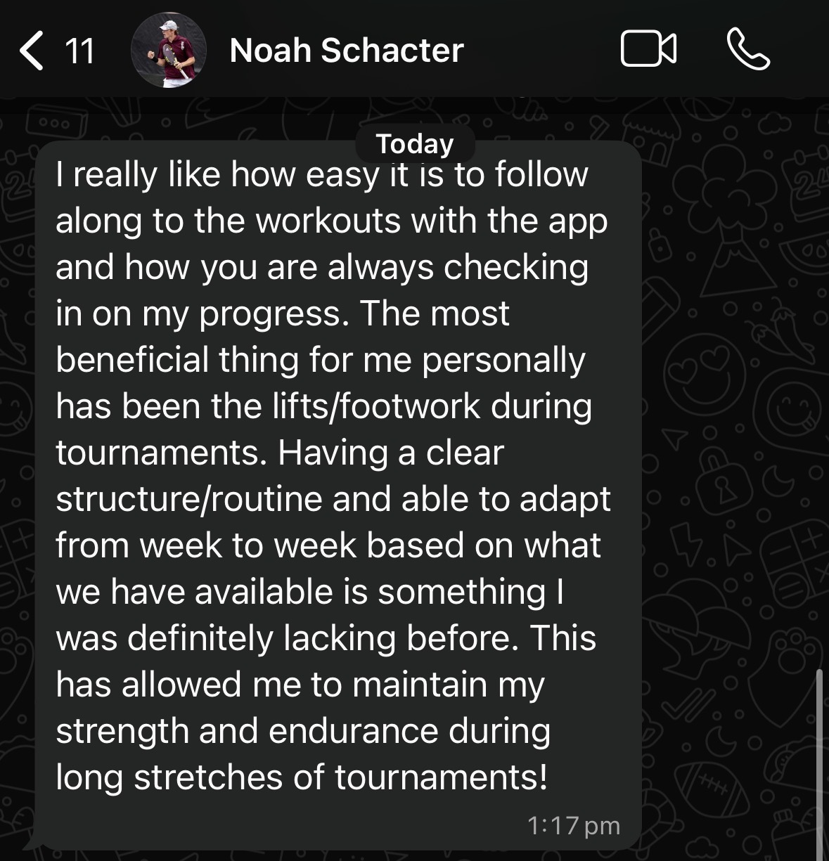 It’s customized training designed to improve power, speed, mobility, and injury prevention for tennis players — delivered remotely through guided workouts, video coaching, and ongoing support.