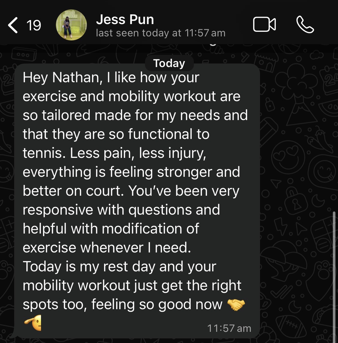 Basically, at the start of each week, I will make a rough plan of things I want us to be working on. As the week progresses, sessions will be adjusted (if necessary) depending on match/training schedule, physical/mental readiness, injury, travelling. fatigue etc. For example, I may have programmed only mobility on a match day. However, you have just won 6-1 6-1 in 55minutes. As the intensity/duration of your match was not high, it gives us a chance to do some sort of workout after.